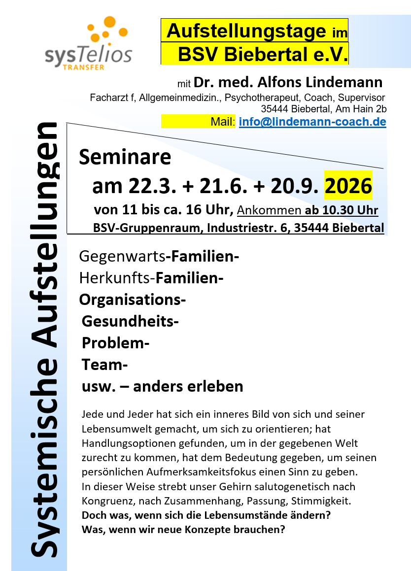 - Familienaufstellungen - von Bert Hellinger (1925 - 2019) und andere entwickelt; bei mir oft zum Psychodrama (Jacob Levy Morene 1889 - 1974) erweitert.